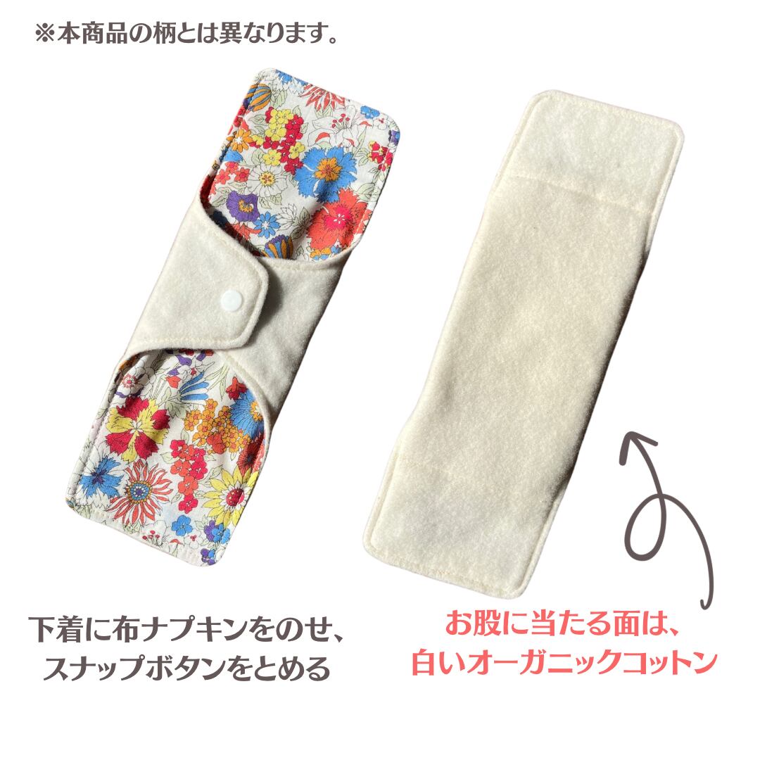 また、オマタに当たらない部分は、かわいらしい生地となっております。下着を選ぶように、布ナプキンも選びませんか?